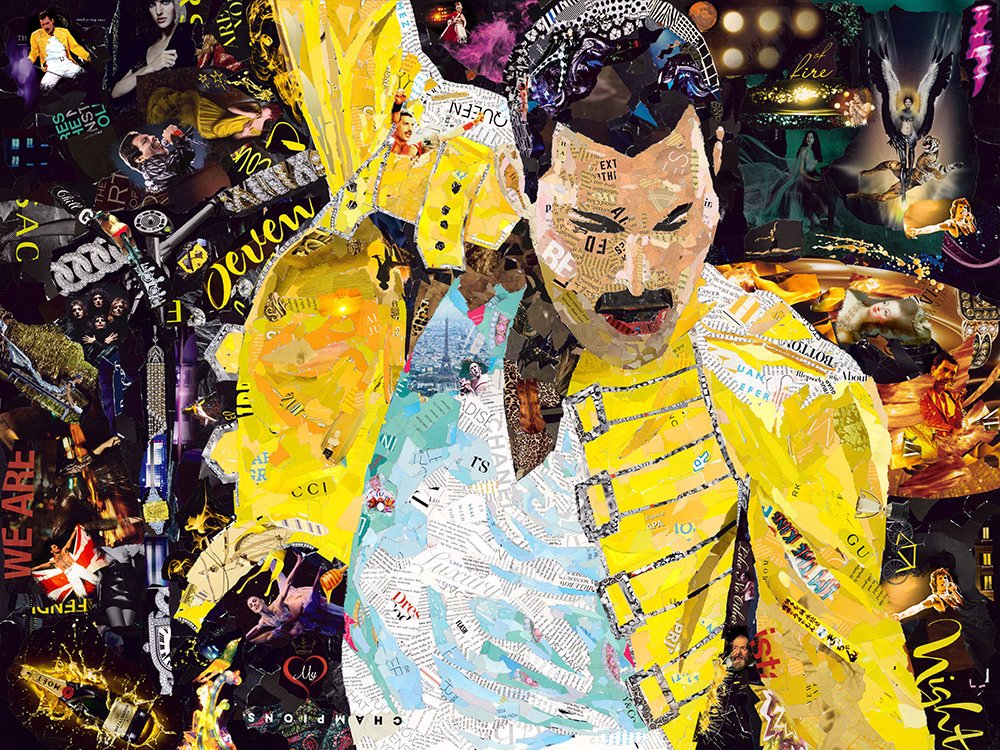 Orlando-based collage artist layering pop-culture fragments and personal history into vivid, mixed-media portraits.